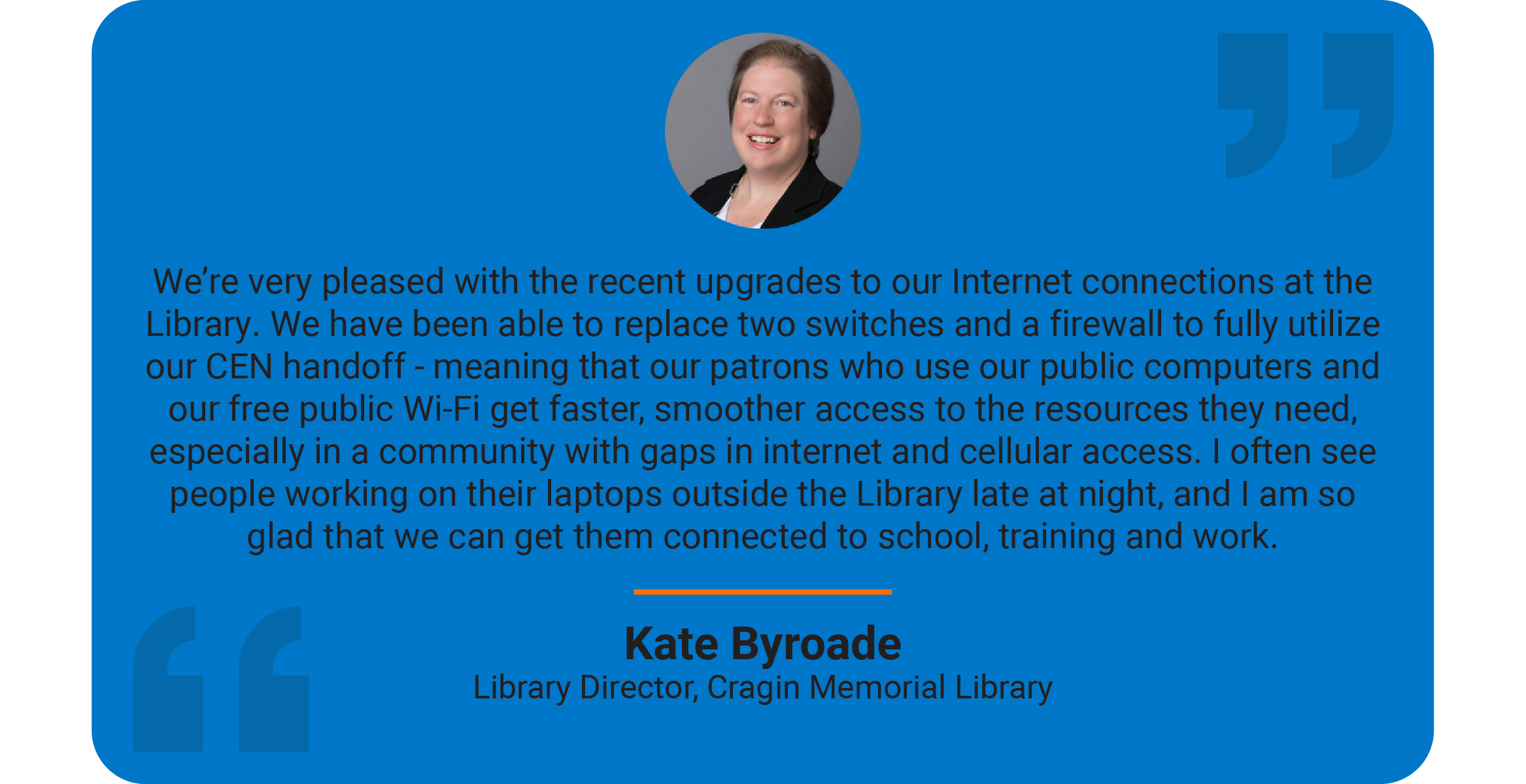 The CT State Library partnered with CEN and Novus Insight to improve internal network connections for Connecticut’s primary libraries in support of digital access and inclusion. CEN’s public-private approach helped local libraries maximize their internet and network-based experiences by assessing, remediating, and upgrading internal connections within their network infrastructure. Many local area networks (LAN) and wireless LANs (WLAN or WiFi Networks) benefited from equipment and associated infrastructure upgrades within their buildings, as observed during the CLFC (Connecticut Libraries Fiber Consortium) fiber projects. These efforts contributed to building an infrastructure plan for the future to support operations, patron use, and efforts to bridge the digital divide in our communities.